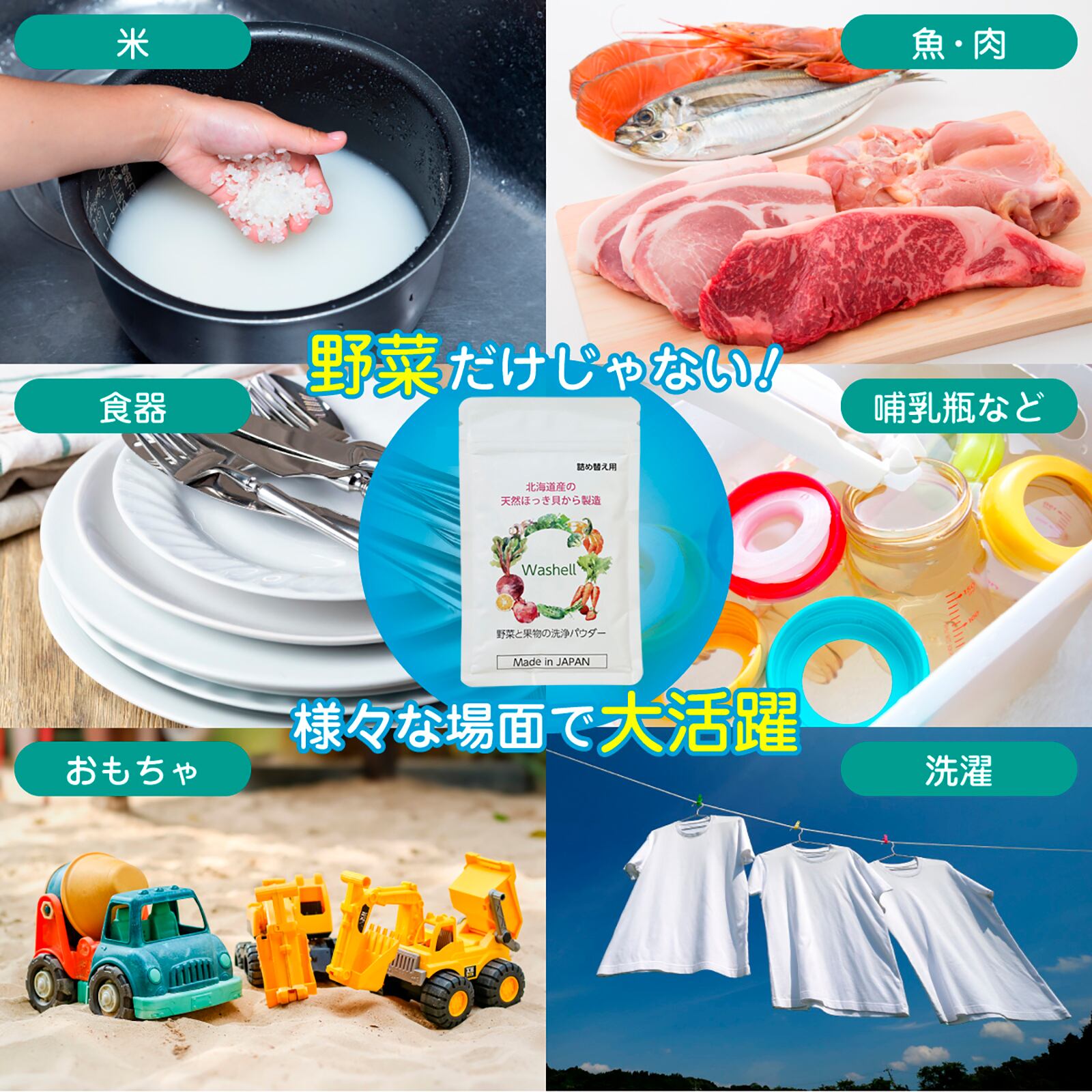 北海道産の天然ほっき貝100%で出来た野菜や果物の残留農薬やワックスを落とし、除菌・抗菌するパウダーです。